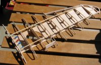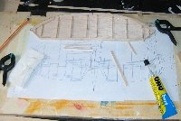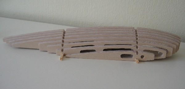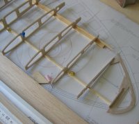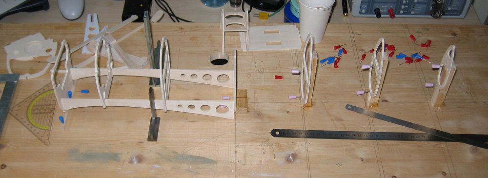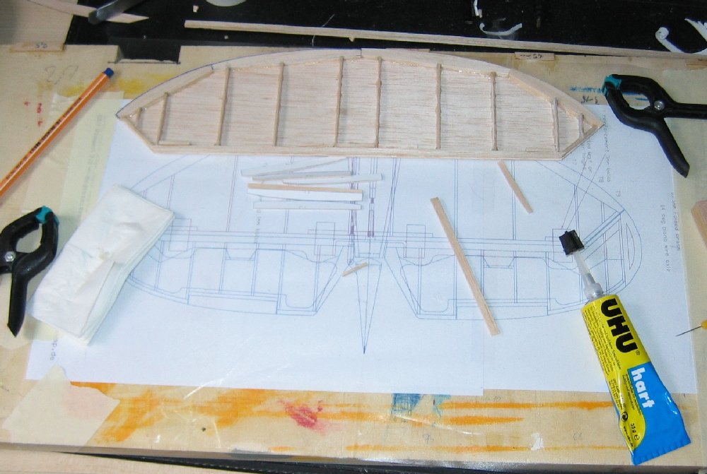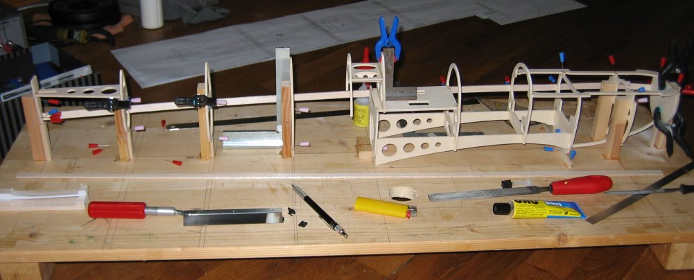 Für den restlichen Rumpf muss man sich dann allerdings eine Helling anfertigen. Alternativ kann man natürlich die Spanten wie im Plan eingezeichnet Horizontal teilen und den Rumpf in zwei Hälften bauen... |