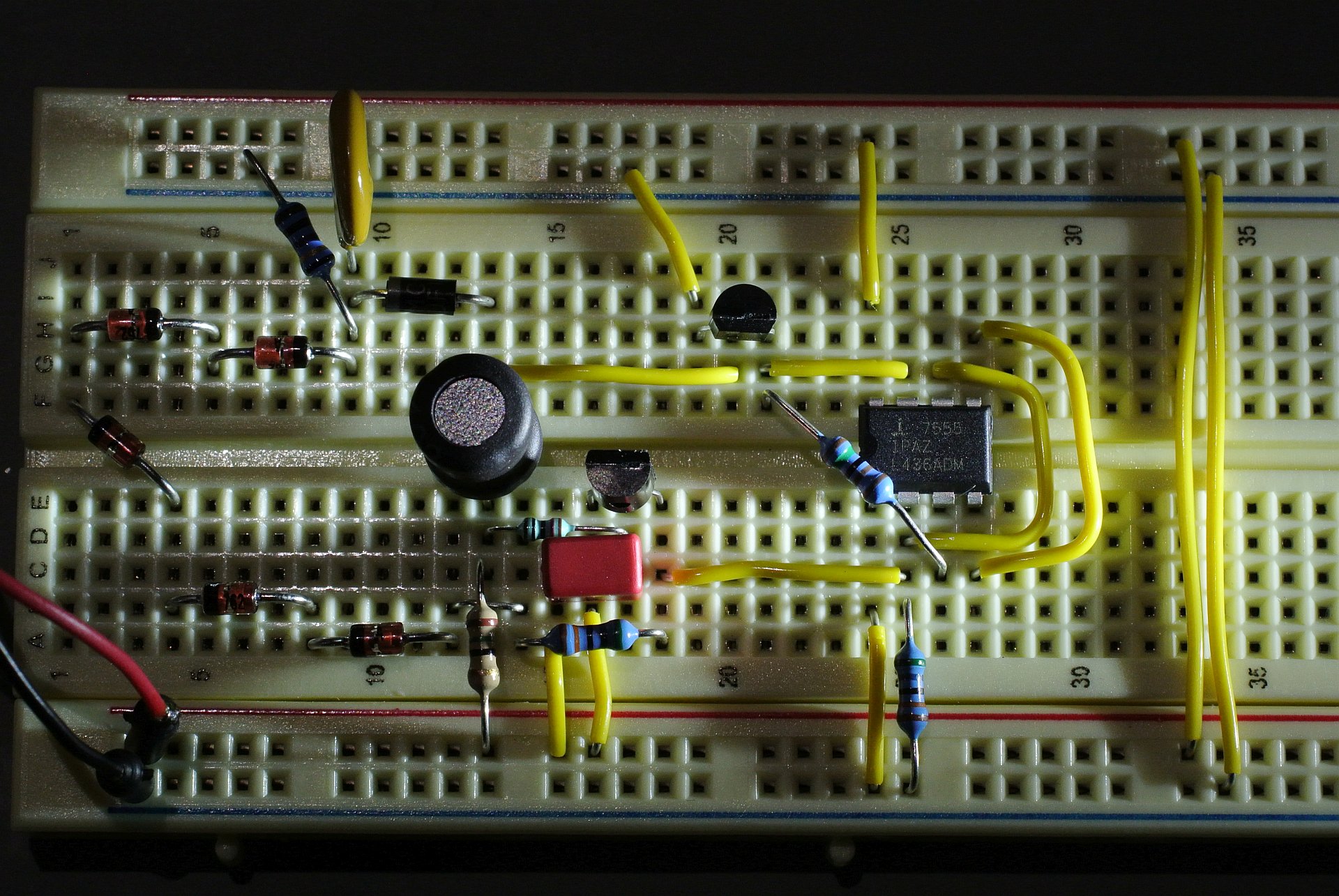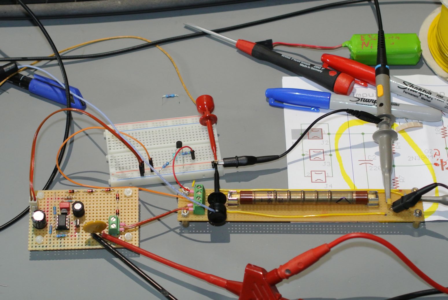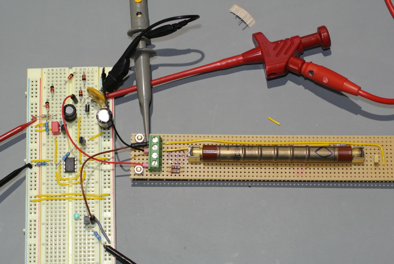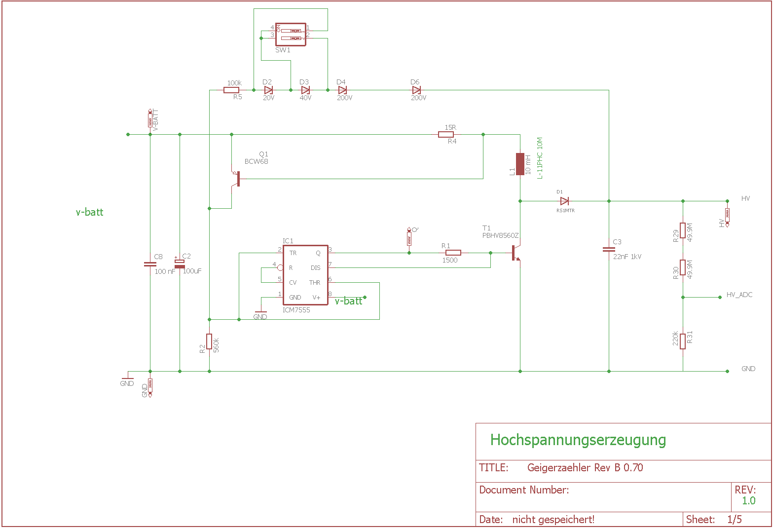 Der erste Schritt war die Erstellung einer geeigneten Hochspannungsquelle. Die MyGeiger Versorgung ist regelbar, aber über den Mikroprozessor realisiert. Die Schaltung von MightyOhm ist unabhängig mit einem 555 Timer erstellt, aber ungeregelt. Also weitere Recherchen angestellt, LTspice gestartet und ein Steckbrett rausgeholt. Zuerst wollte ich die MightyOhm Schaltung einfach um eine Regelung erweitern, nach einigen Tipps bei mikrocontroller.net wurde es dann aber eine weitgehend neue Schaltung.