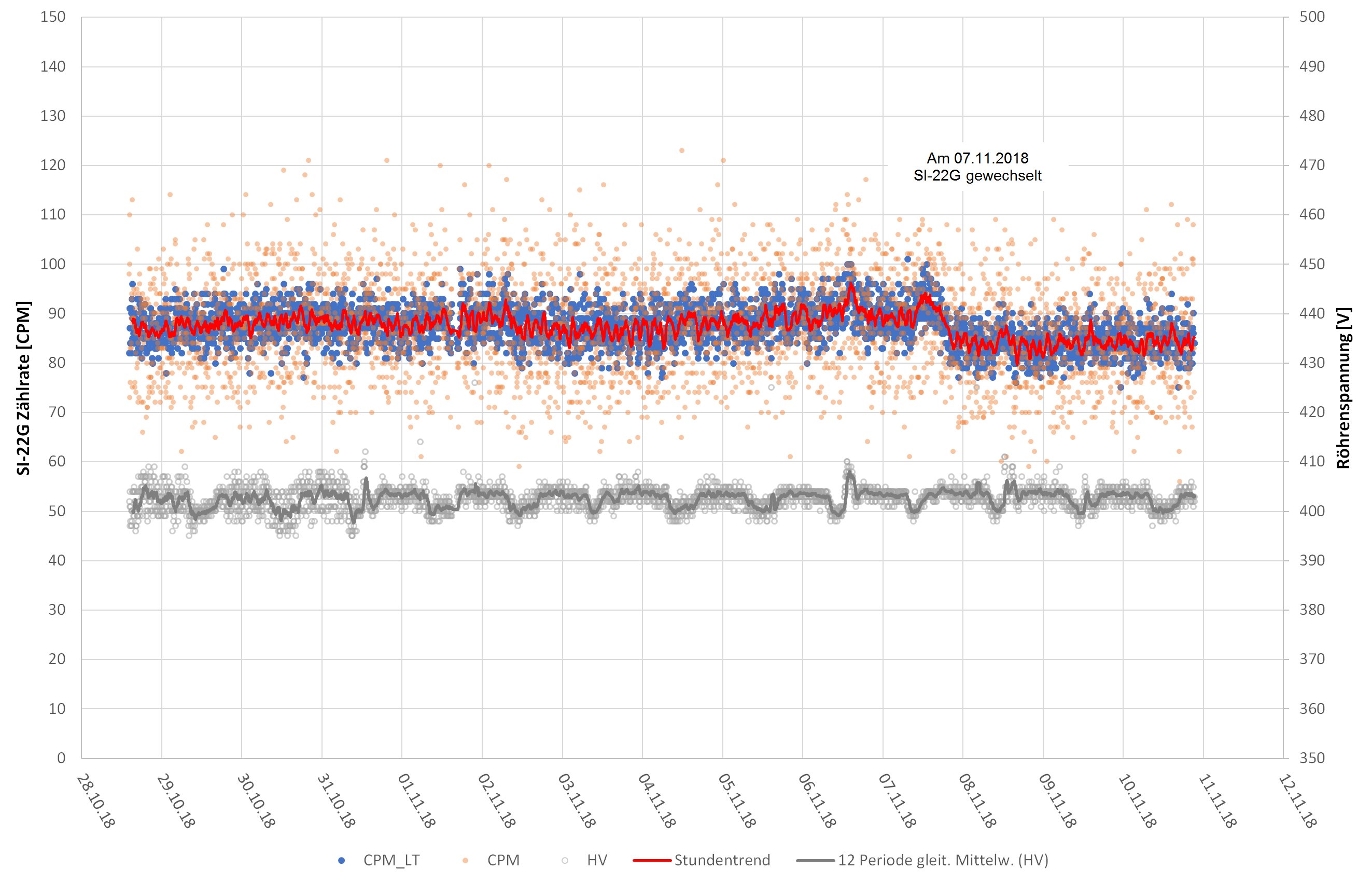 Hier ein paar aufgezeichnete Daten mit dem SI22-G. Es hat eine deutlich höhere Empfindlichkeit als das SBM-20, daher ist es sehr gut geeignet Hintergrundstrahlung zu beobachten.