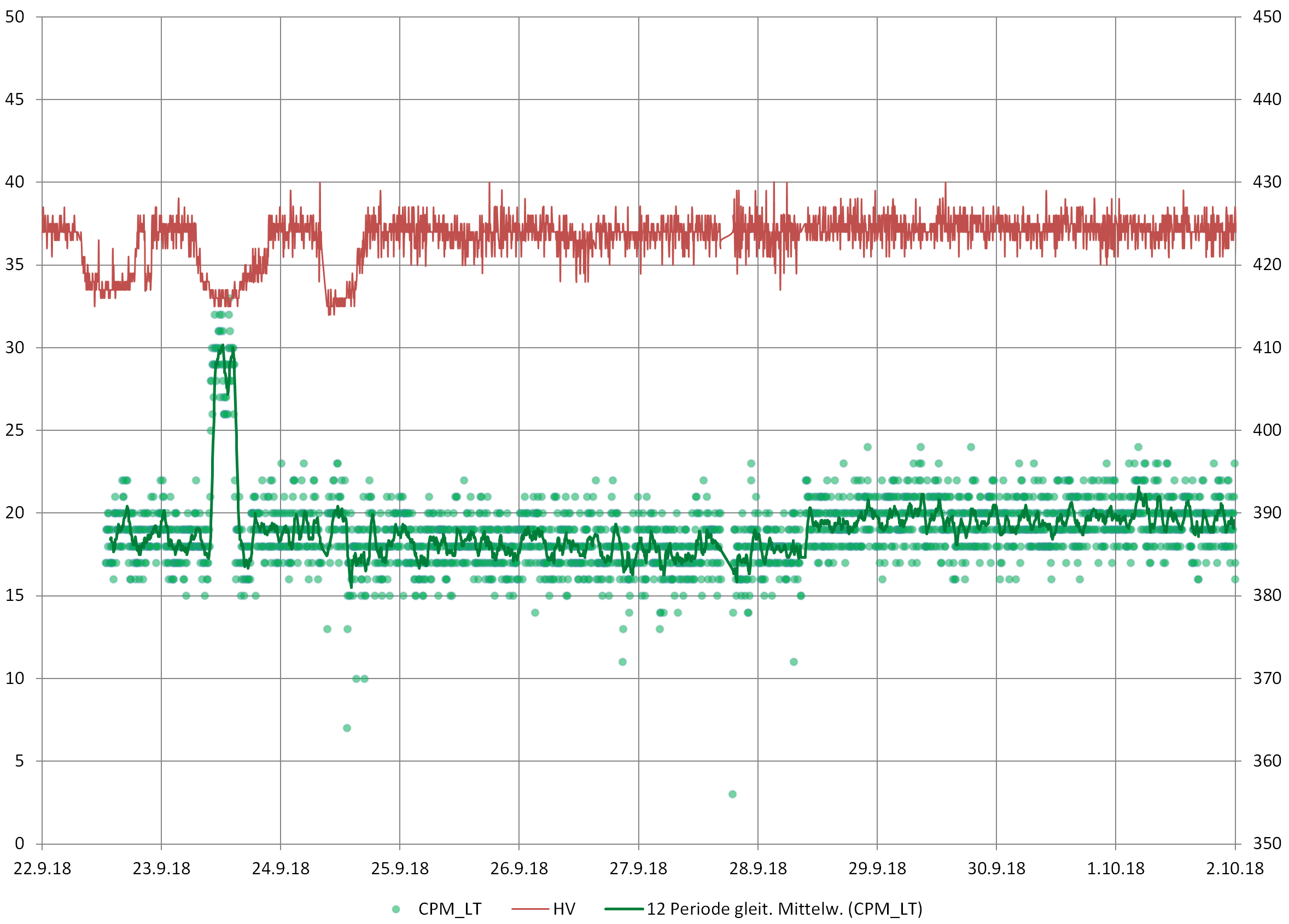 langfristige Mittelwert für die Hintergrundstrahlung in Hamburg, bei der Verwendung von SBM-20 Geiger-Müller-Zählrohren. Die hohe Zählrate am 23.September