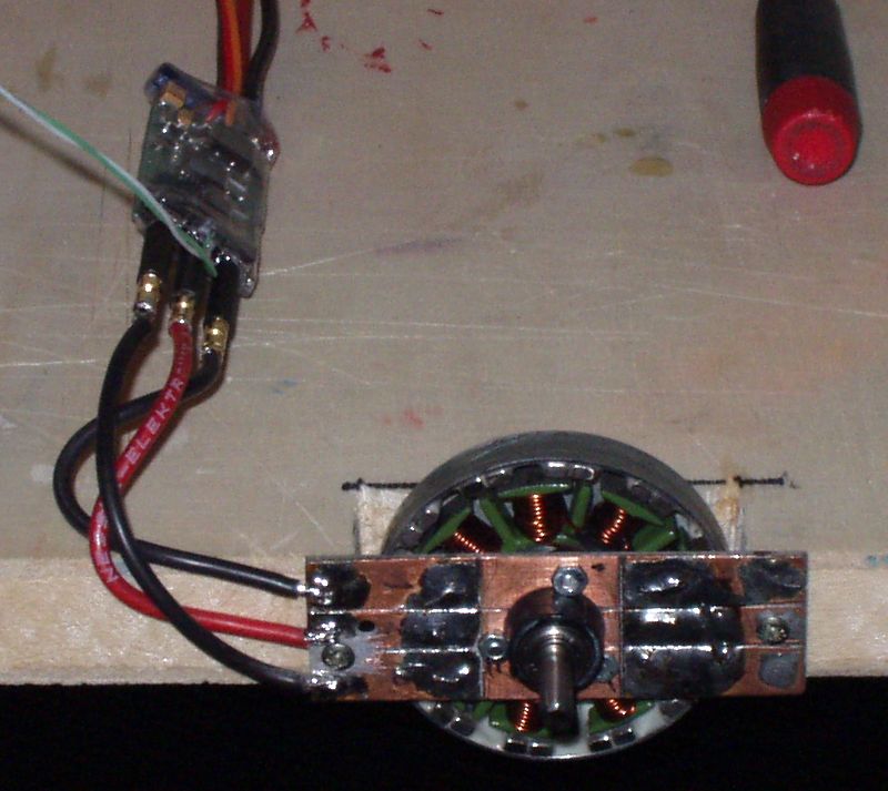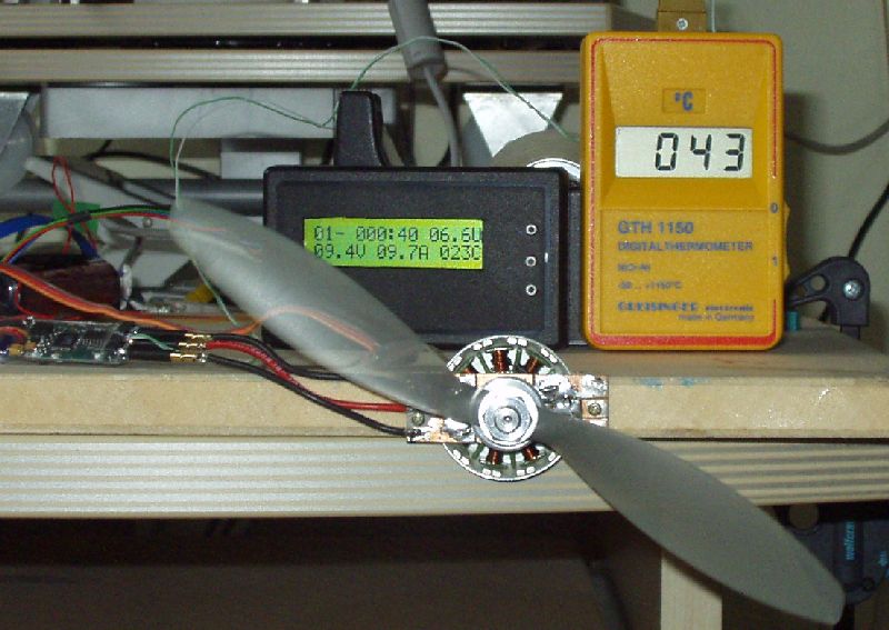 So die ersten Tests sind gelaufen und es sieht nicht gut aus für den ditto-Motor. Er hat bei den hohen Strömen einen schlechteren Wirkungsgrad als die Getriebe-Variante (Speed 400 7,2V; 2,33:1). Dies ergibt sich aus Messungen mit dem selben Propeller und einer Auftragung Drehzahl über Eingangsleistung. Gemessen wurde mit 22,5° Timing, bei kleineren Werten verschluckt sich der Regler und einem 9X3,8 APC Slow-Prop.