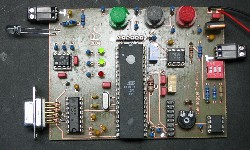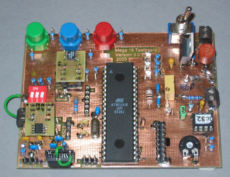 Um die Möglichkeiten der Prozessorvarianten von Atmel zu erproben, habe ich mir zuerst ein eifaches Testboard gelötet mit dem die ersten Erfahrungen gesammelt werden können.