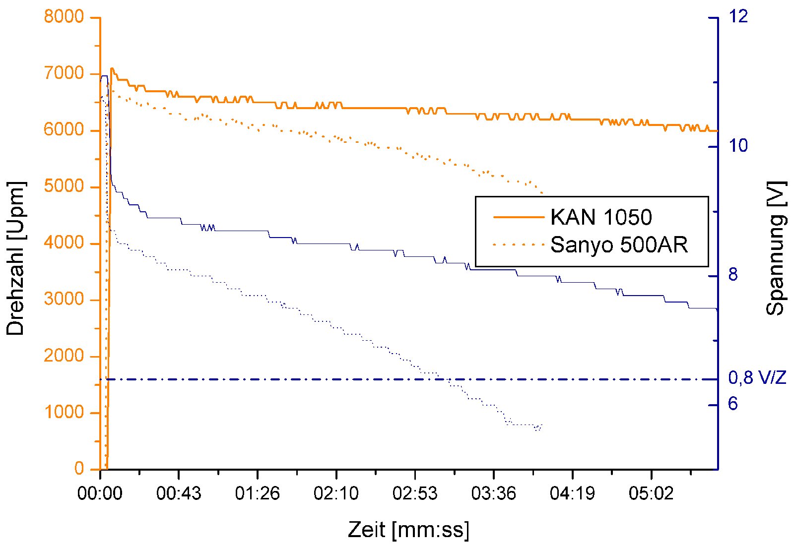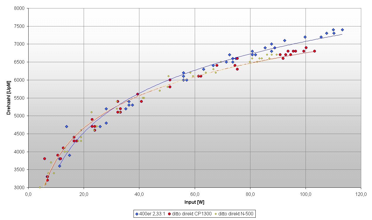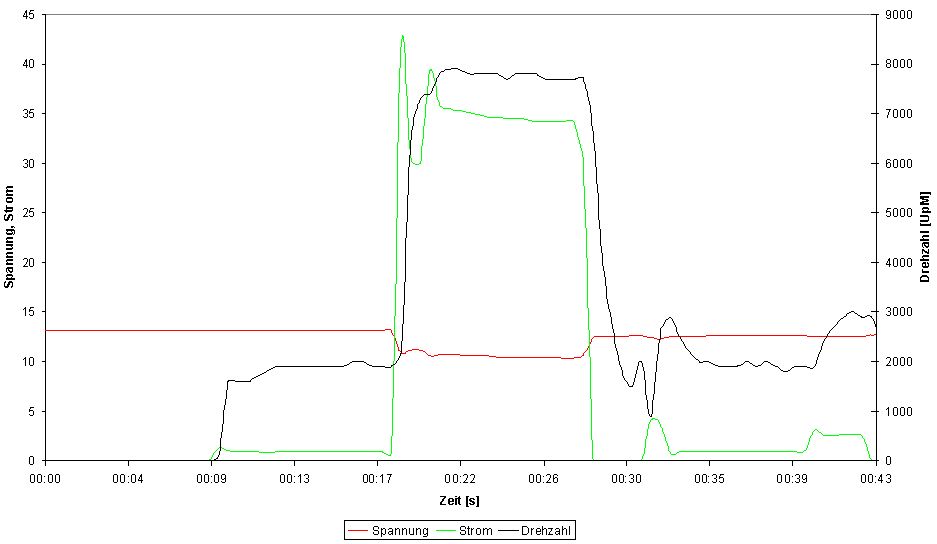 Gemessen mit 8 Zellen CP1300 bzw. Sanyo 500AR und einen 9x3,8 Zoll APC Prop