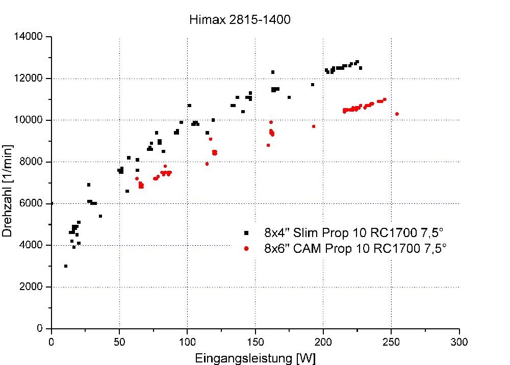 Gemessen mit einem CAM Speed Prop 6x6 Zoll, 8 Zellen KAN 1050 und SBL micro Modus 3