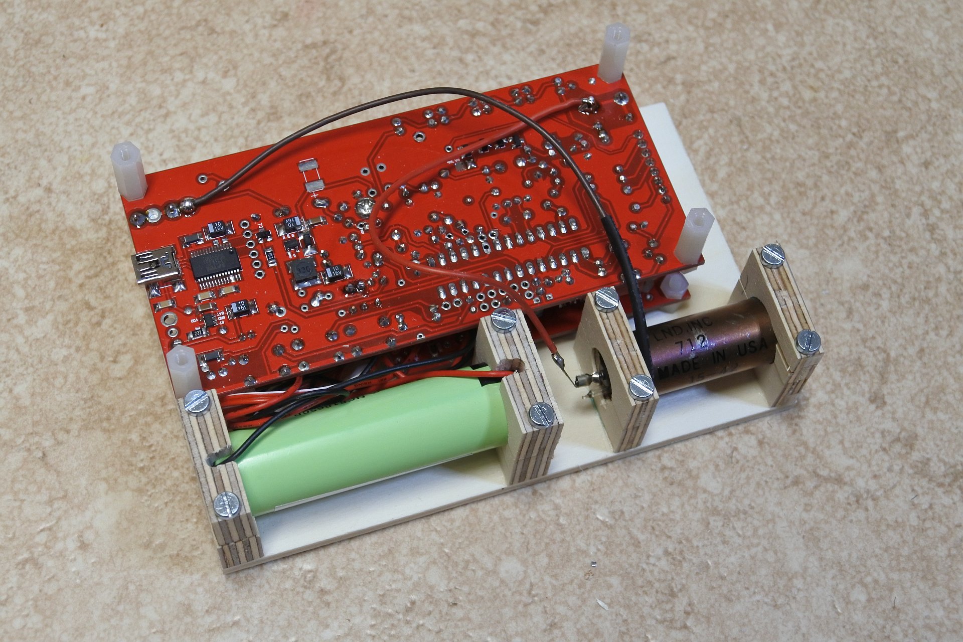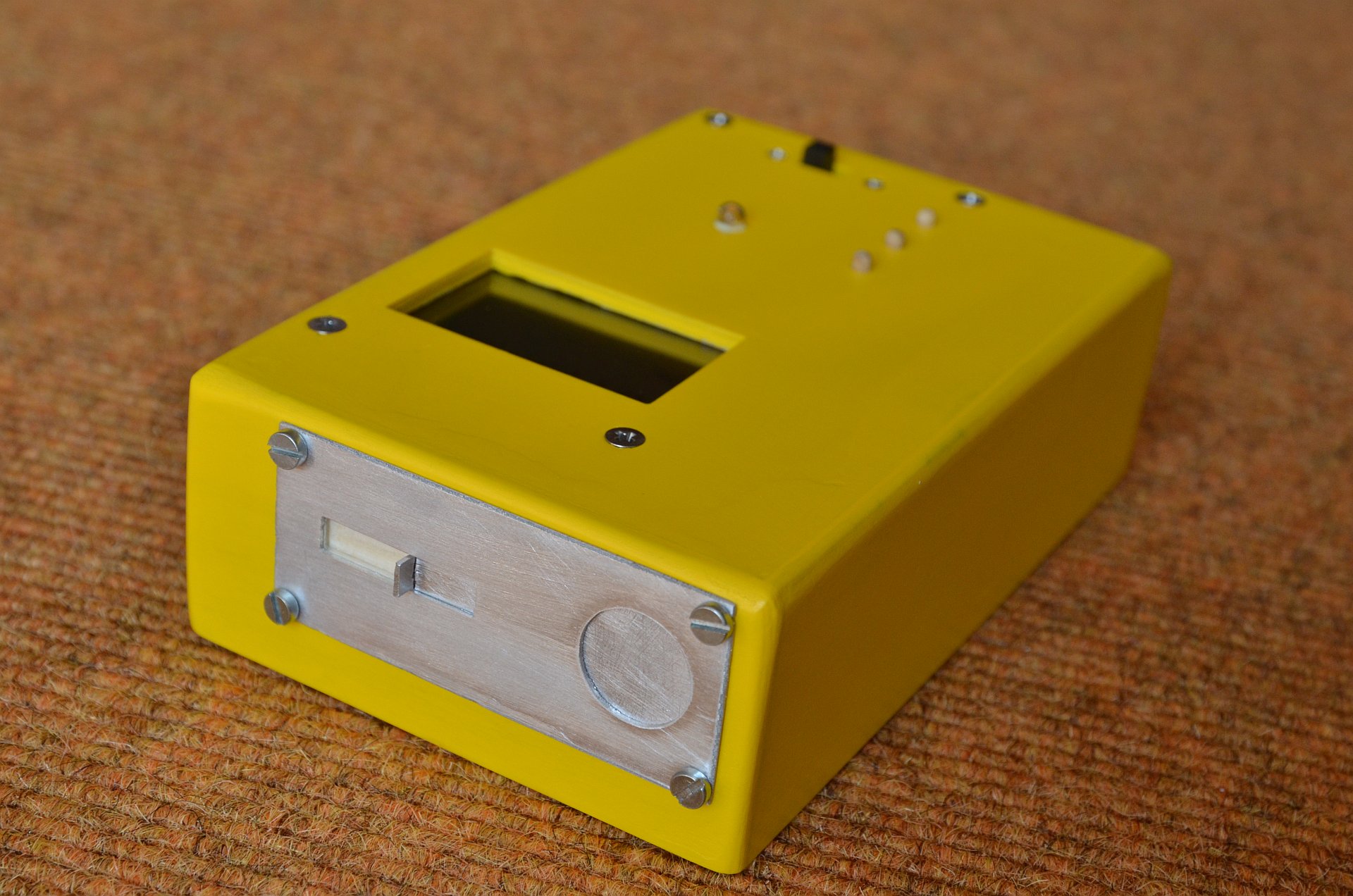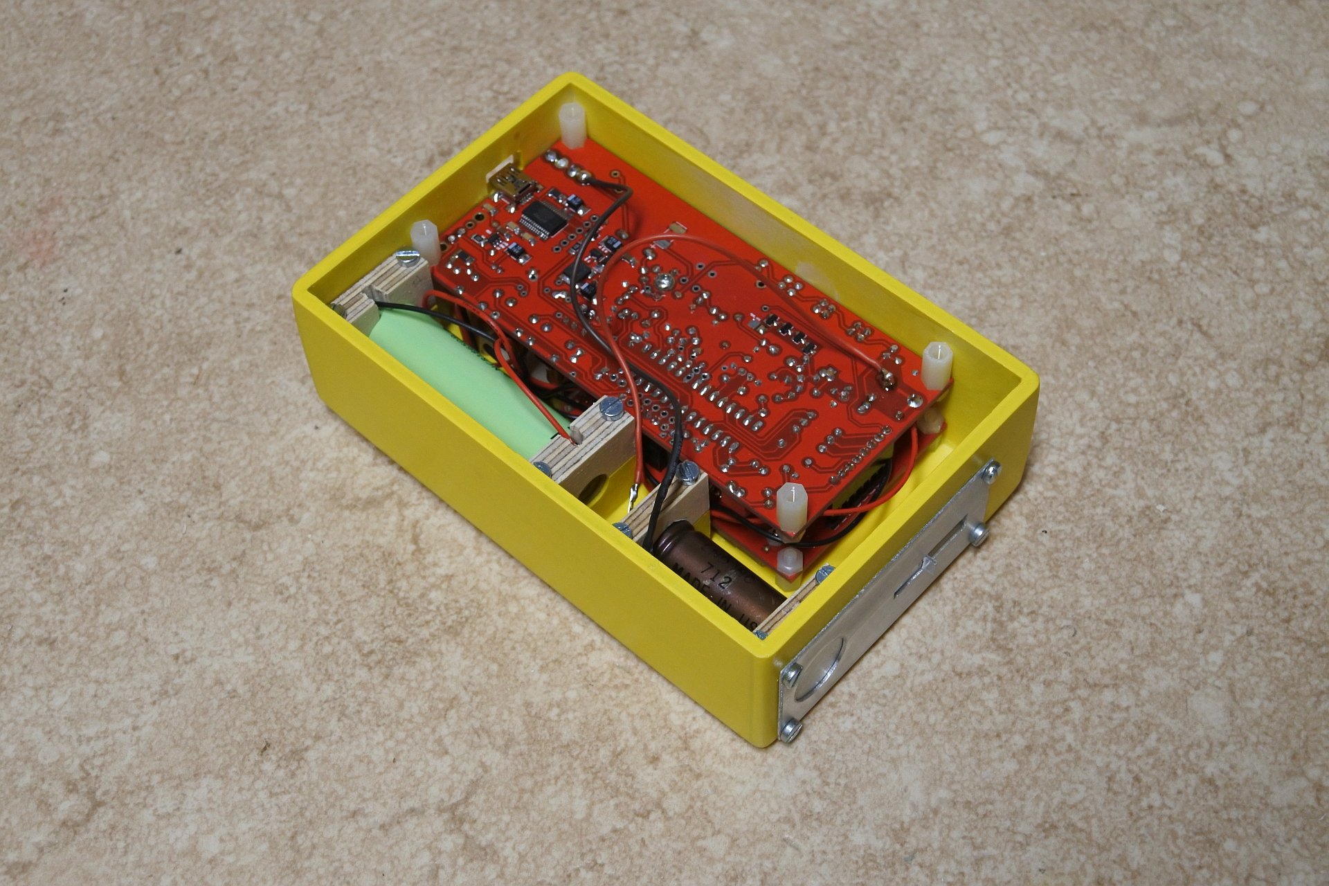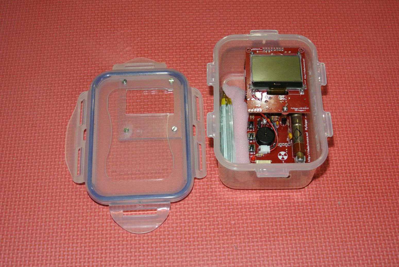 Ein wirklich sehr schoen gemachter Bausatz, den ich in eine Haushaltsplastikdose eingebaut habe. Versorgt wird der Geigerzaehler aus einer LiIon/LiPo-Zelle und die Ladeschaltung ist auch eingebaut.