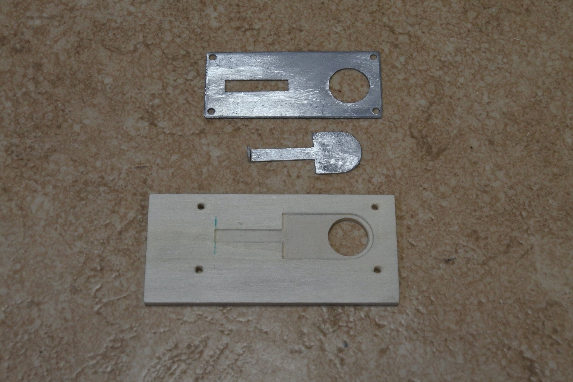 Um das empfindliche Glimmerfenster des Alphazählrohres in normalen Betrieb zu schützen gibt es einen kleinen Schieber aus 0,8 mm Aluminium.